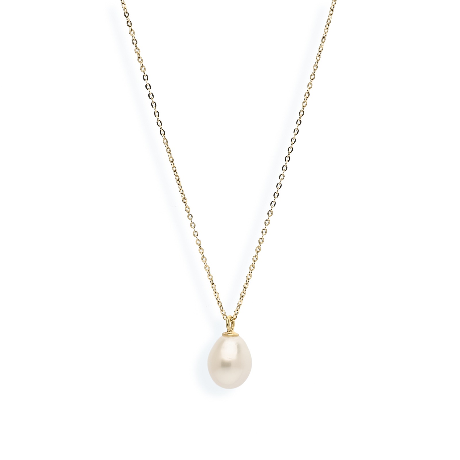 Κολιέ με λευκό μαργαριτάρι γλυκού νερού Fresh Water Pearl διαστάσεων 8,0 x 10,0 χιλιοστών σε σχήμα Drop (σταγόνα) ποιότητας ΑΑΑ. Διαθέτει χρυσή αλυσίδα 14 καρατίων καθώς και χρυσό κούμπωμα ασφαλείας 14 καρατίων. Το συνολικό μήκος της αλυσίδας είναι 40 εκατοστά.