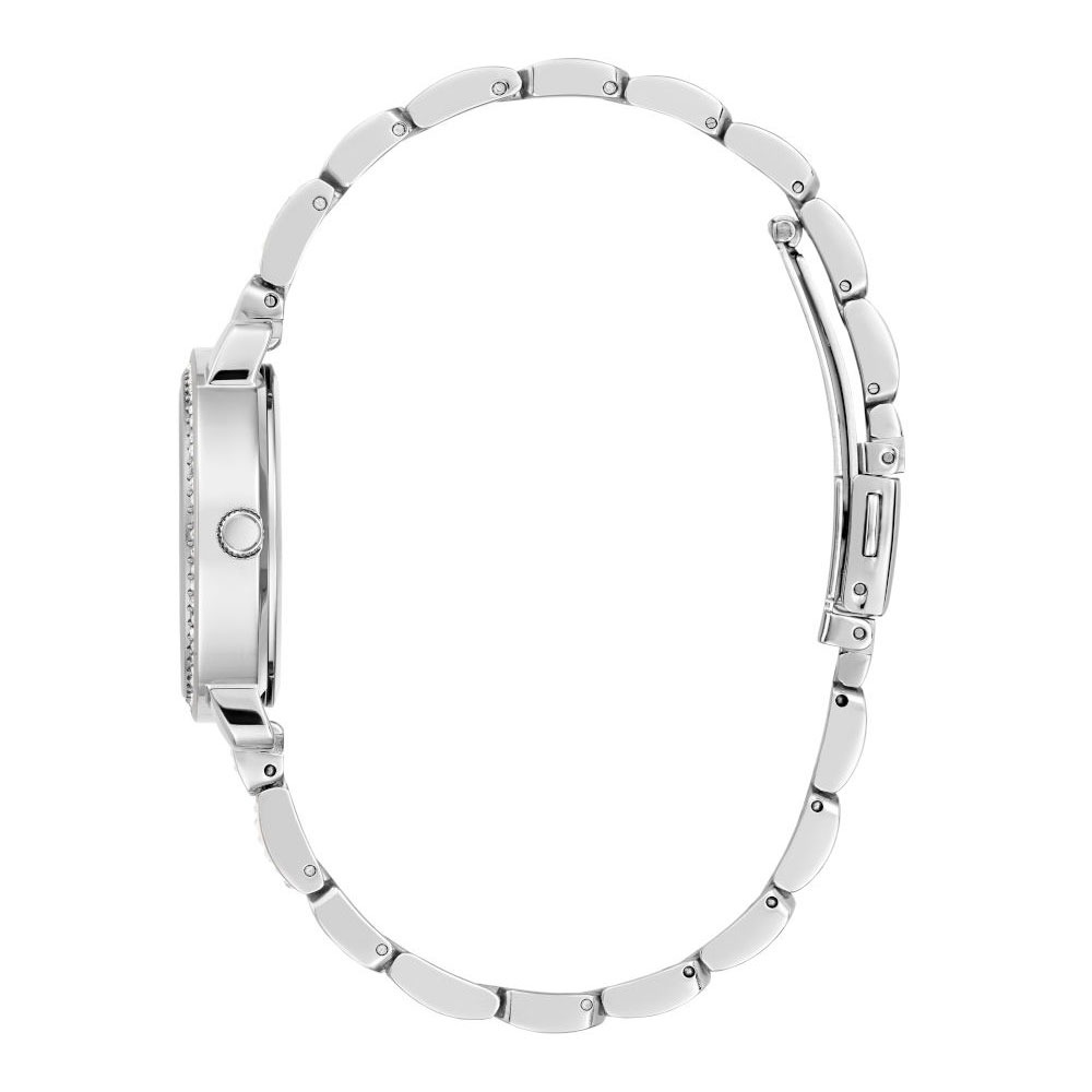Γυναικείο ρολόι Guess με ασημί καντράν και όμορφα διακοσμημένες πέτρες πάνω στη στεφάνη και στο μπρασελέ.